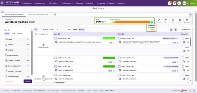 The roster uses EOH – Client Allocation as its data source, so all shifts appear in the calendar view on the roster screen. Each section is displayed as part of the Stage Breakdown.