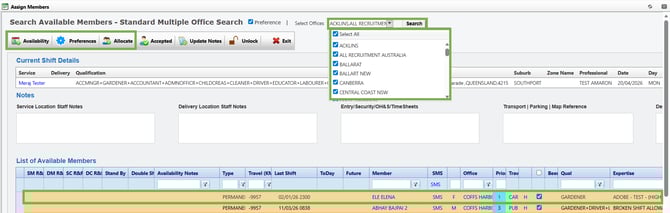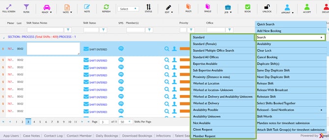 - Hover over Search to view all available search options for finding a suitable Member for that shift.