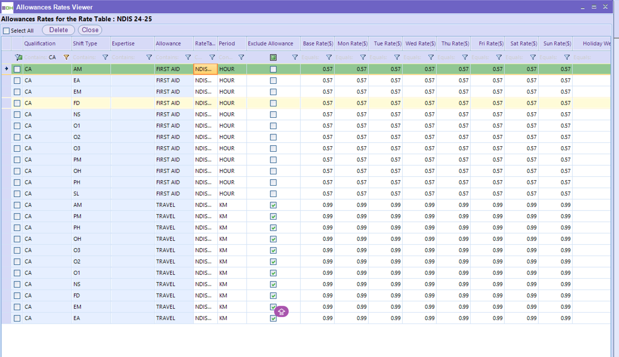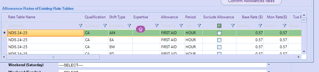 Allowances within Rate Tables