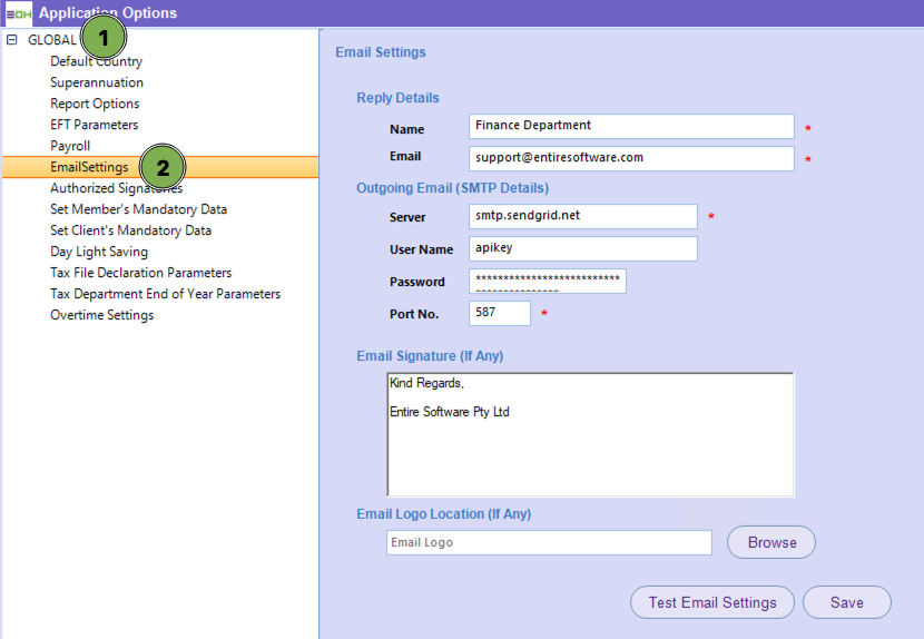 Please note, any email signature or logo set here will transfer to your payslip and invoice emails. It is important that you NEVER change your Outgoing Email (SMTP Details) as any changes to these details will stop emails from being sent from Entire OnHire