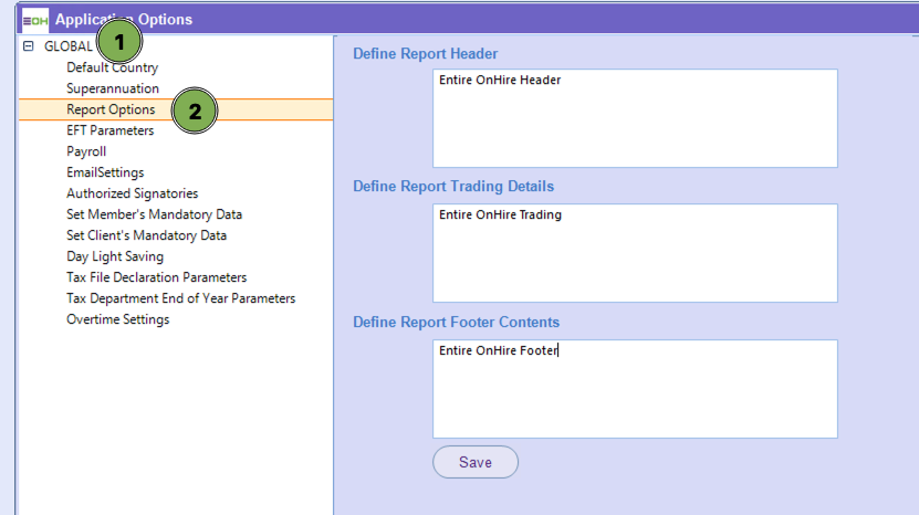 October 6, 2025 Application Options - Global Setting - Report Options This is where you are able to update your report formatting options Just fill in your data and click save