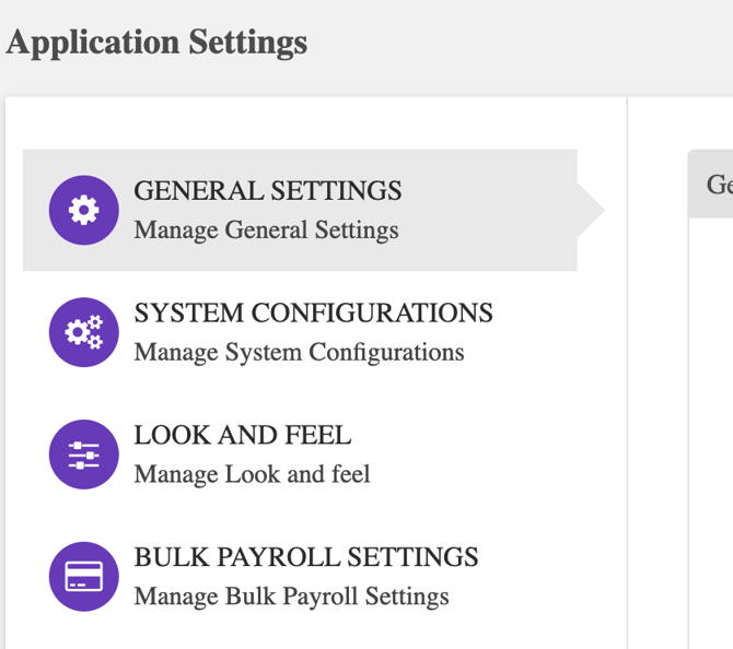 - Within the application settings, you will find three categories: 'General Settings', 'System Configurations', and 'Look and Feel' and "Bulk Payroll Settings"