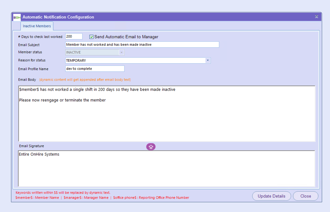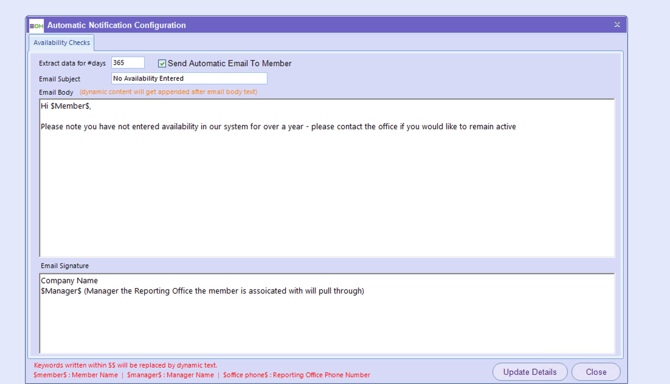 | Email Signatures | Customised signatures can be added for both Member and Manager emails, such as company name or department. |