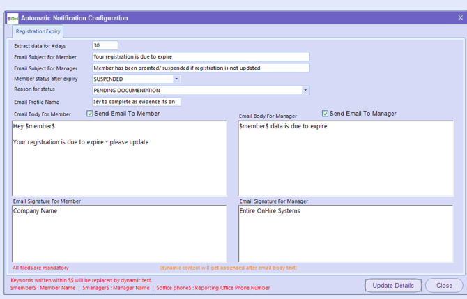 | Email Body for Manager | Message sent to the manager (uses placeholders such as $member$ to identify which staff member’s registration is expiring). |
