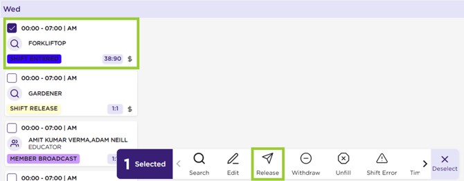 - Step 1: Select the shift with the status Shift Entered by ticking the checkbox next to it, then click Release in the action panel.