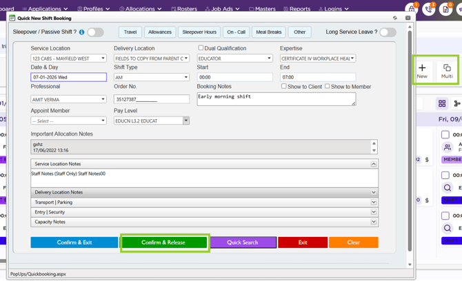 - Step 2: When creating a single or multi shift from the New or Multi on the menu will give you an option to Confirm & Release.