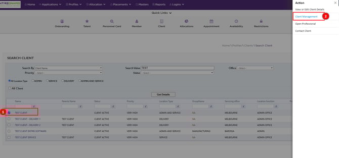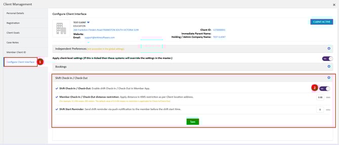Clients - Search for Client - Open Client Management - Configure Client Interface - Shift Check-In / Check-out, Change to yes as shown below.