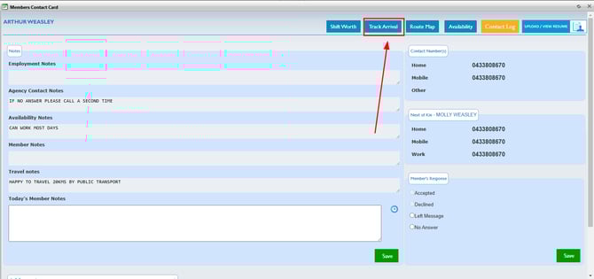 Within the allocations screen, select the member's name and open the Member contact card and select Track Arrival