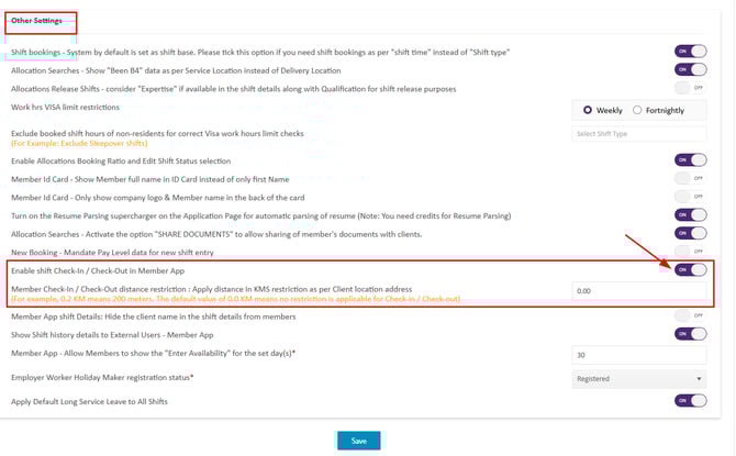 In Other Settings provide the value greater than 0.0 KM in ‘Member Check-In / Check-Out distance restriction: Apply distance in KMS restriction as per Client location address’ to set the distance restriction for the members in the Member App.