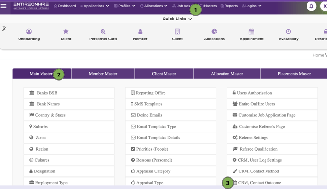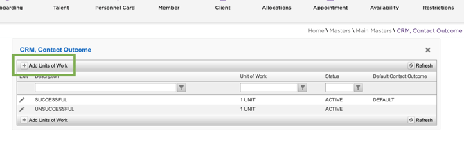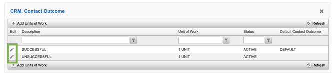 To edit an outcome, you press the edit icon on the far left of any item in the masters, then you change the about settings as appropriate. To remove an outcome, you must first ensure that there are no contact logs with this particular outcome, and then you set the status to INACTIVE.