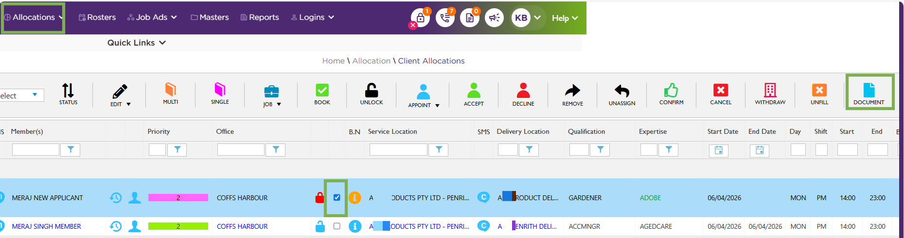 Shift documents must be uploaded from the Allocations screen. These documents are specific to an individual shift and apply only for the duration of that shift.