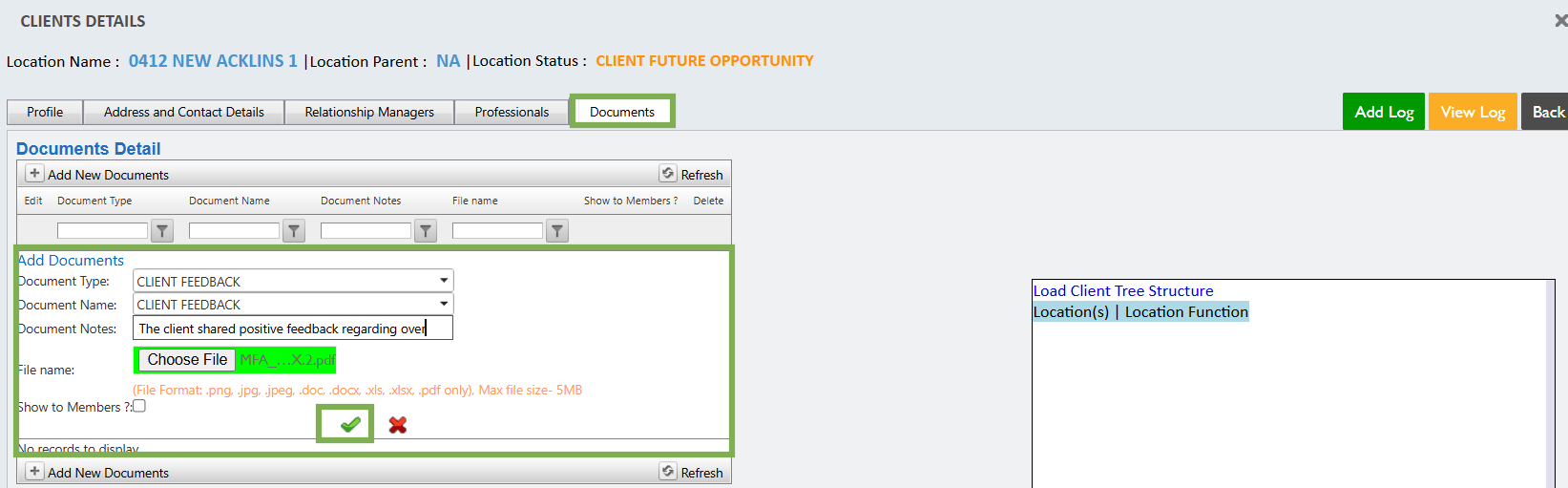 Client Location documents attached to the Client Details page are visible only to members working at that specific client location.