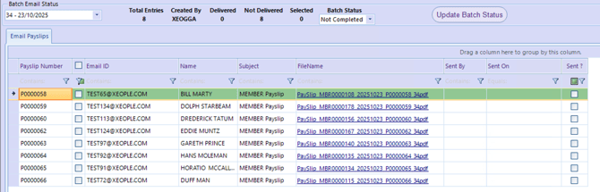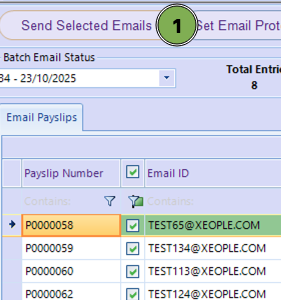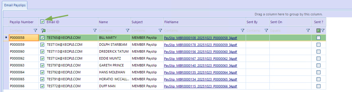 (b) Individual payslips may be selectively sent by checking the checkbox next to the payslip number. If all payslips are to be sent, click on the checkbox in the header which will check all checkboxes.