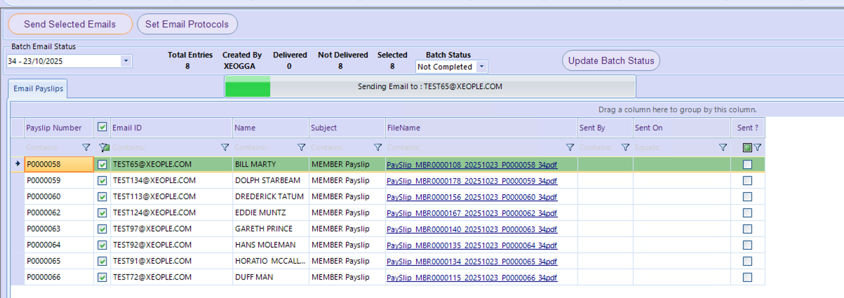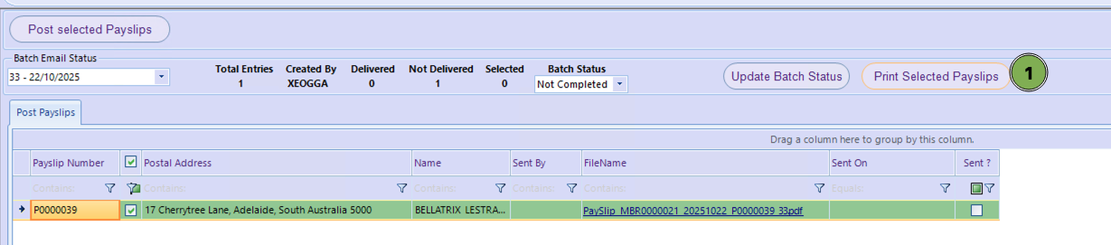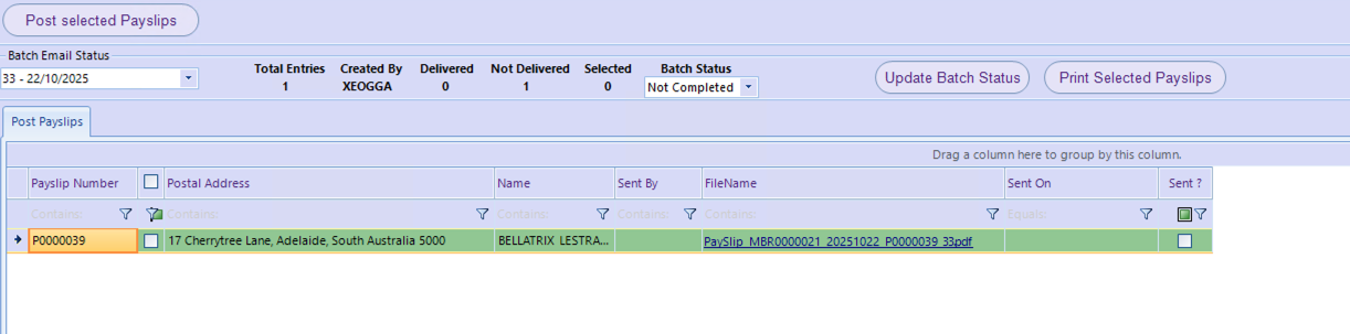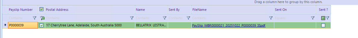 (c) Click on the ‘Send Selected Emails’ button to send the emails with attached payslips. The ‘Sent By’, ‘Sent On’ and ‘Sent?’ columns will then be populated to record that the emails have been sent.