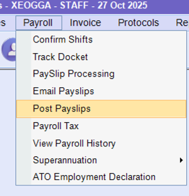 (a) Click on the ‘Post Payslips’ menu item from the Payroll menu.