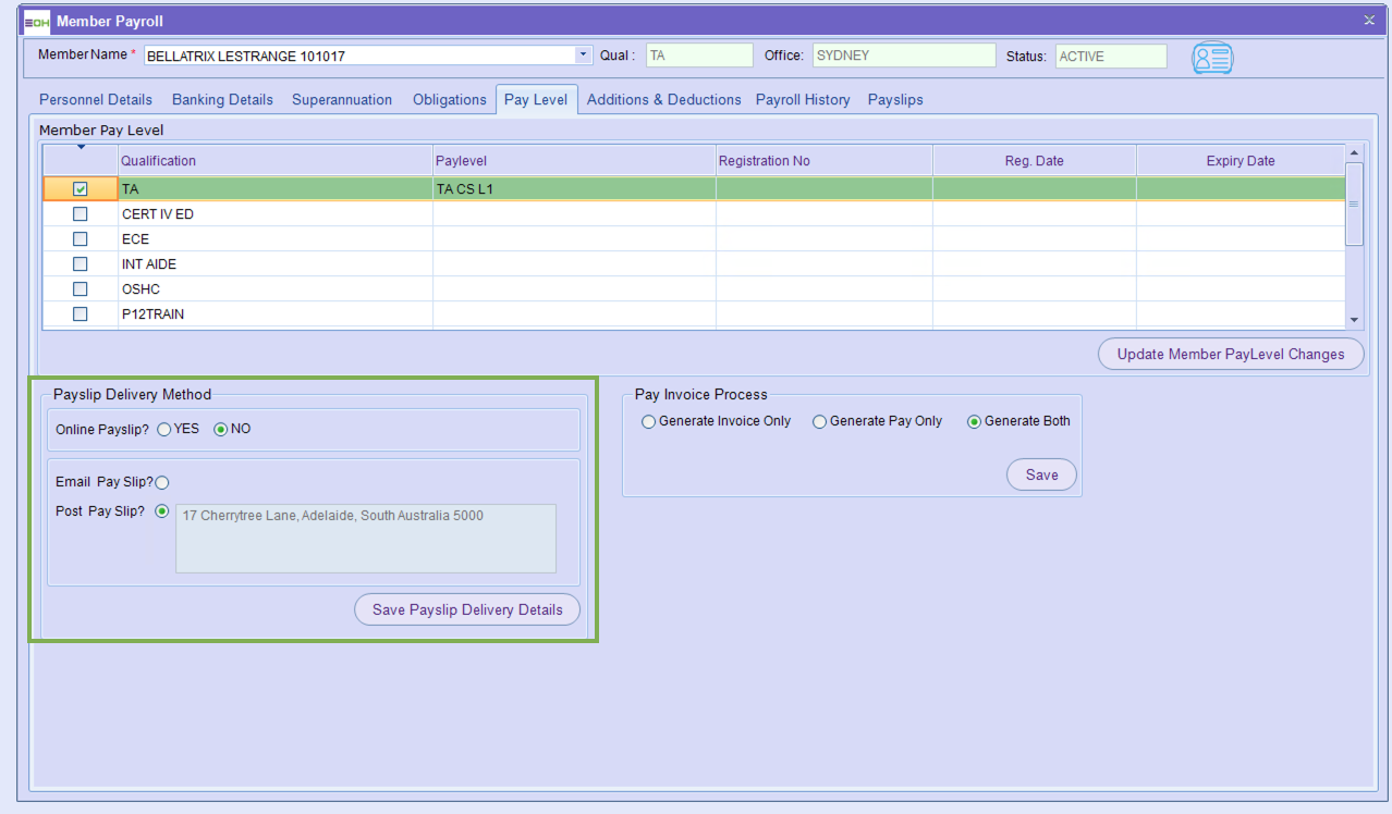 Payslips now need to be sent to members to notify them of their bank payment deposits. Members can receive their payslips in three ways, via email, post or online (through the Member App). The way in which the member receives their payslip is defined on the Member Record.