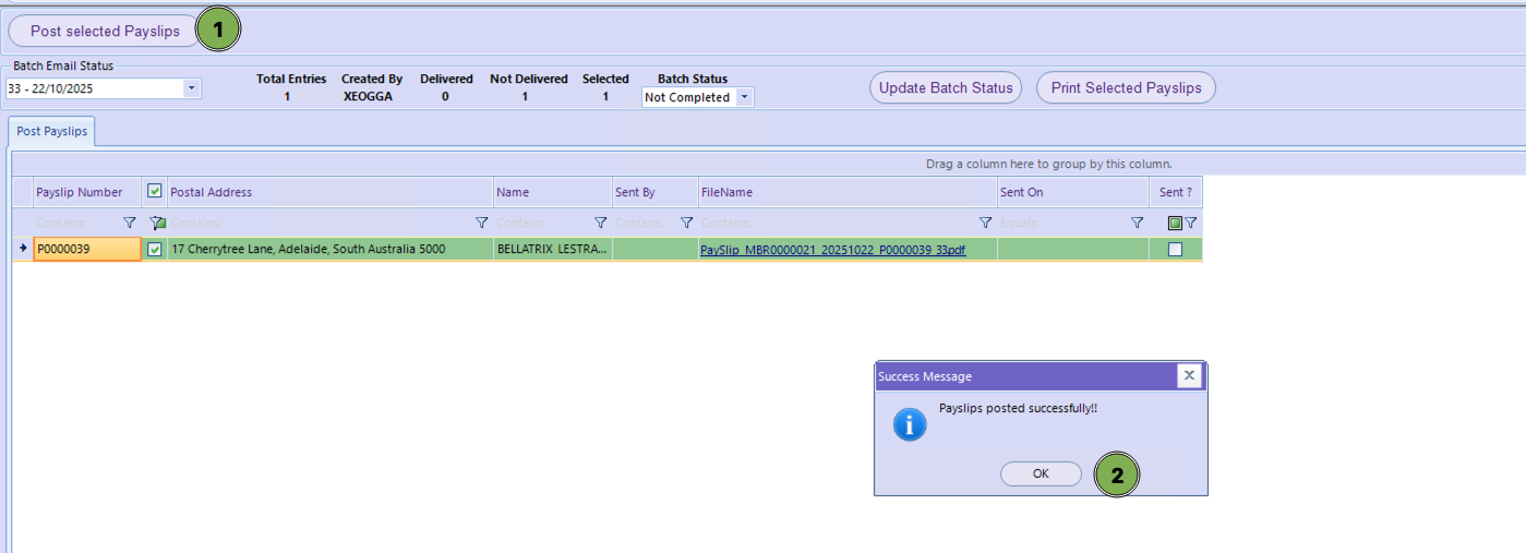 (c) Click on the ‘Post Selected Payslips’ button. A confirmation message is displayed. Click OK. The ‘Sent On’ and ‘Sent?’ columns will then be populated to record that the payslips have been posted, and the date/time they were posted.