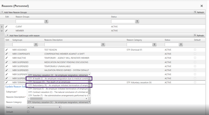 In the Reasons (Personnel) Master of the Staff portal application, the Cessation Type Code for the Lump Sum payments are mapped from the Subgroups 'MBR TERMINATED' in the Reason Category, and the Reason Category selected can be either Ill health (I), or Redundancy (R).