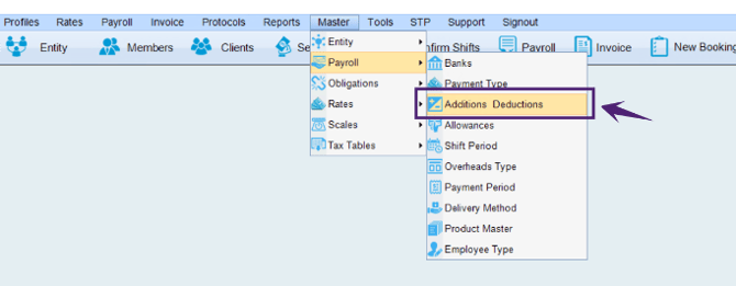 To open the Additions and Deductions master screen, select Master → Payroll → Additions Deductions.
