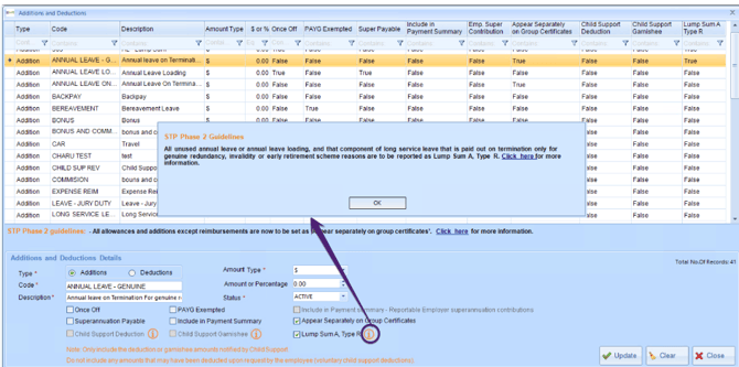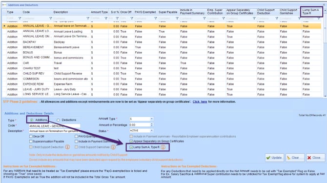 In case you are reporting the Lump Sum amount in your STP Phase 2, you need to select the Addition as Lump Sum Code A Type R in the Addition and Deduction master screen and map the addition in the Single Touch Payroll Allowance Codes Mapping screen.