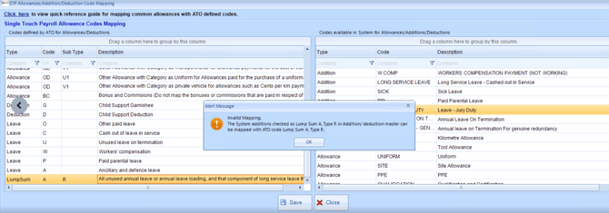 In the Allowance Codes Mapping screen, if this addition is mapped with any other code apart from Lump Sum A, Type R code, a validation message will appear as shown in the figure below