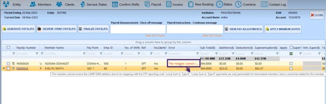 This error message appears in the Error column in the Payroll processing screen as shown in the figure below and the payslip will not be generated