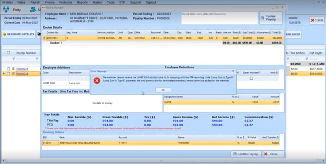 In this scenario, when the staff clicks Update Payslip in the Payroll Manager screen, a validation message appears as ‘The member cannot receive the <Addition Name> addition due to its mapping with the STP reporting code "Lump Sum A, Type R". "Lump Sum A, Type R" payments are only permissible for terminated members, hence cannot be added for the member.’ as shown in the figure below