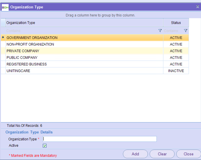Type in Organisation Type, Mark Active and Click Add