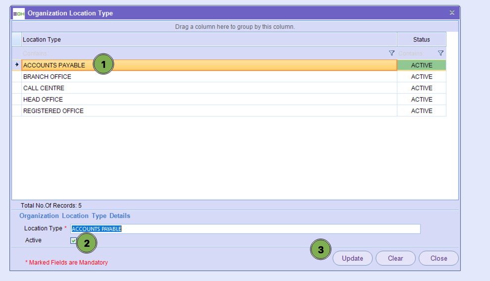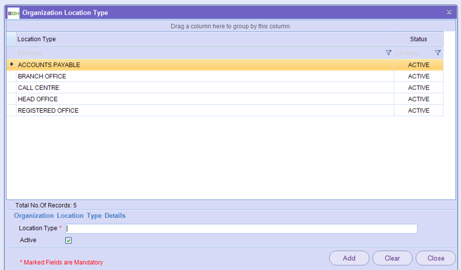 Within this section, you are able to update the location types relevant to the set-up of an organisation/Entity