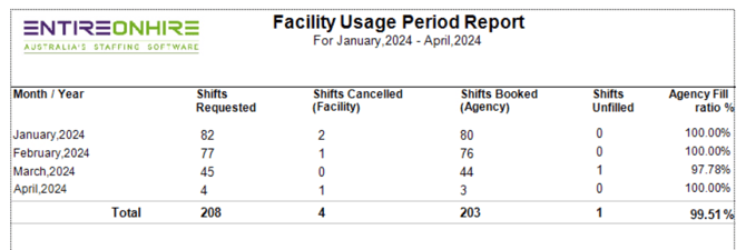 The Facility Shift Usage Period Report provides shift statistics over a larger time period on the total number of Shifts entered per month that were: Requested, Cancelled, Booked and Unfilled, along with the agency fill ratio.