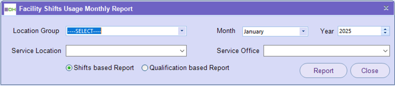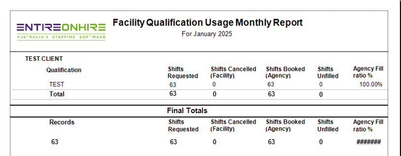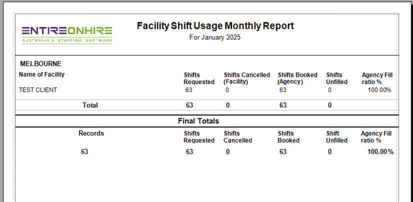 The Facility Shifts Usage Monthly Report provides figure calculation on the total number of shifts entered in a selected month that were: requested, cancelled, booked and unfilled, along with the agency fill ratio. This report has the option to display the figures based on shift totals or expand to show based on qualifications at each Service Location.