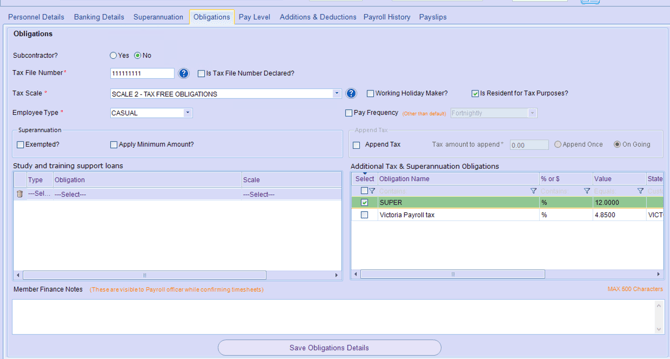 Within this tab, you can update an employee’s tax details and add finance notes, which will display in the confirming shifts section.