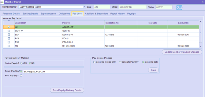 Within this tab, you can update a member’s pay level, configure payslip delivery preferences, and manage the payment invoice process. It’s important to ensure all details are completed accurately—if any required fields are left empty, shift confirmations may not display correctly. Review and update the information here as needed.