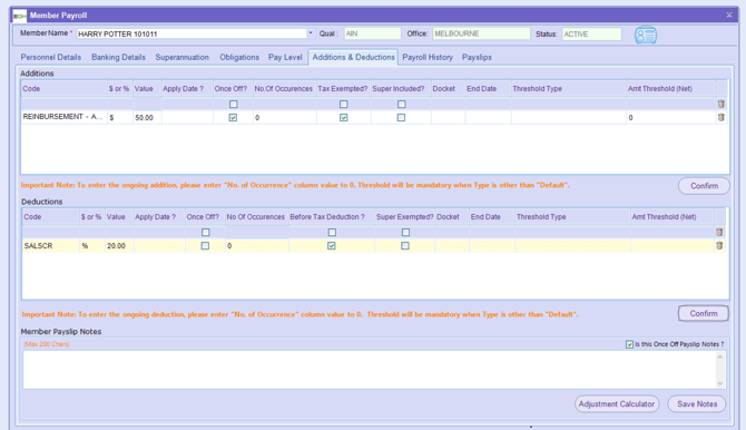 IMPORTANT - Please note that a member cannot be paid more than 9999.99 per pay run via additions/deductions