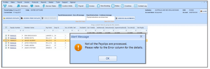 (e) Click on the ‘Generate Payslips’ button. If there are issues with the generation, an alert message will be displayed as in the example below.