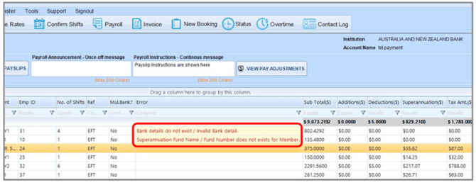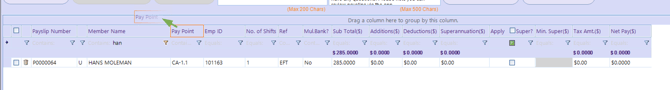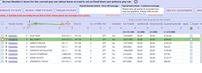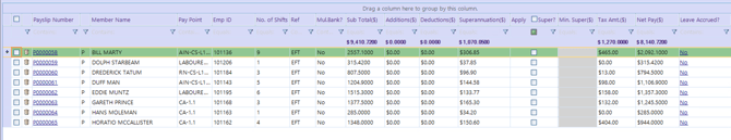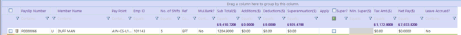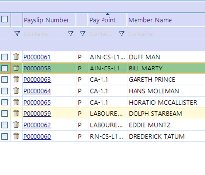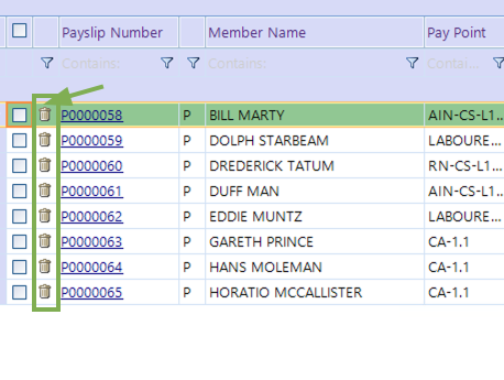 The trash bin symbol at the start of each row allows members to be deleted from this stage of the pay run. This is used if an error is detected in the row details. Deleting the member sends all the member’s shifts back to the Submit Dockets stage.