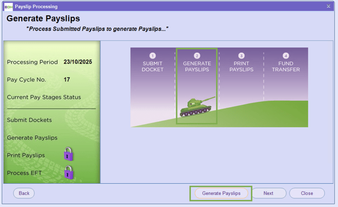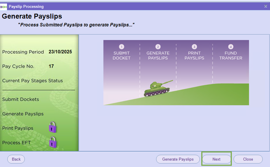 Hank the Tank now indicates that we are at the Generate Payslips step of the pay run.
