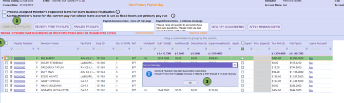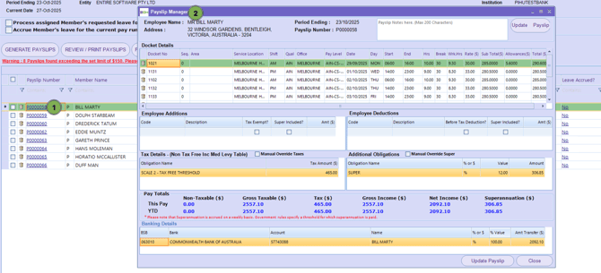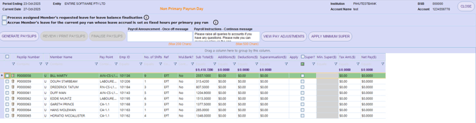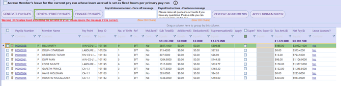 (g) In this example, member bank details and superannuation details are missing, and so the pay run cannot continue until the issues are rectified. In this case, the member records may be updated with the missing details and then the payslips generated again, or the affected members may be simply deleted from this pay run by using the trash bin icon. The latter will be done for this example.
