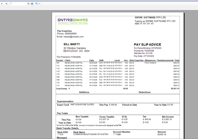 From this screen, the user may change the display of shifts on the screen, delete specific shifts from the payslip, add a payslip-specific message, add an addition, add a deduction, adjust the tax amount and adjust the superannuation amount. These are explained below: