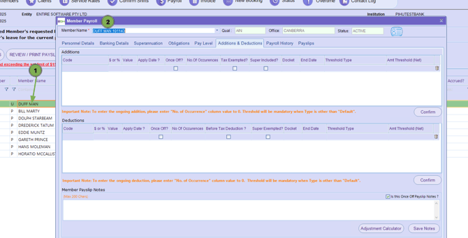 Additions may be added to the payslip using the Payslip Manager Screen, as described above, but they may also be added to the member’s Member Record.