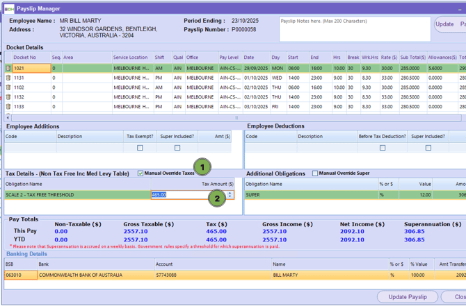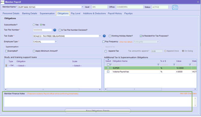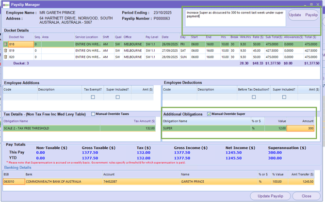 Superannuation is calculated on each payslip, based on the Superannuation settings within the system. However, members may request adjustments to the amount of superannuation that is actually taken out of their pay. To adjust the superannuation amount on a payslip, click on a Payslip Number hyperlink to open the Payslip Manager Screen, and check the ‘Manual Override Super’ checkbox in the Additional Obligations section. Then click into the Amount field. The calculated amount will default but can be adjusted to the desired amount. Refer to the circled section below. Click on the ‘Update Payslip’ button to save the superannuation amount changes and the Payslip Manager Screen will close.