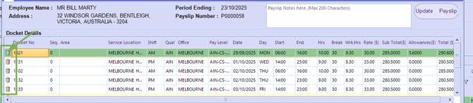 The trash bin symbol at the start of each row allows specific shifts to be deleted from the payslip. This is used if an error is detected in the row details or if the shift is not to be included in the current pay run. Using this feature will send the shift back to the Submit Dockets stage. From there the shift may be processed again in the Submit Dockets stage, deleted again so it is sent further back to the Confirm Shifts stage for updating, or may be left to sit in the Submit Dockets stage to be processed in a subsequent pay run.