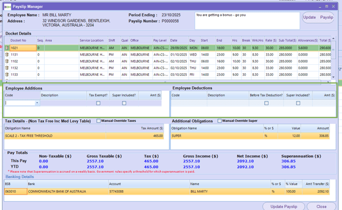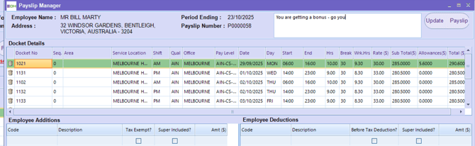 In addition to the Payroll Announcement and the Payroll Instructions messages (which apply to all payslips), it is sometimes necessary to add a message to a payslip that applies only to a single payslip. Such messages can be added to the message field, circled in red below. If there are multiple shifts listed in the payslip, and the message relates to a specific shift, then the docket number of the shift may be referred to, to identify the shift, as in the example below.