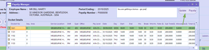 Once the message has been entered, click on the ‘Update Payslip’ button to save the update and the Payslip Manager Screen will close.