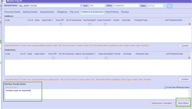 The Additions & Deductions tab of the Member Record is shown below, displaying the Member Payslip Notes field circled in green