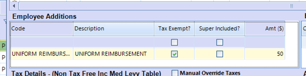 To add an addition, select the relevant Payslip Number hyperlink to open the Payslip Manager Screen. In the Employee Additions section, click into the Code field, choose the appropriate addition from the available list, then tab to the Amount field and enter the required value. The fields for Description, Tax Exemption, and Super status will automatically populate based on the configuration in the Additions and Deductions Master. Please refer to the highlighted area below. In this example, a meal allowance is being added to the payslip.