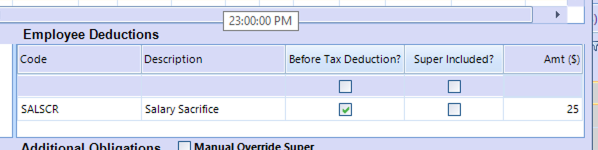 This deduction must use the code ‘SALSCR’, indicating that the deduction is a Salary Sacrifice (employee contribution) deduction.