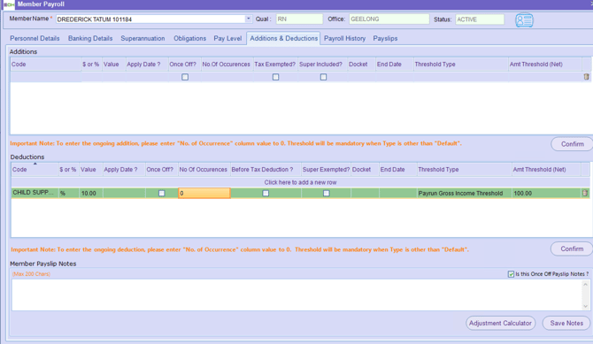 The superannuation amount may be adjusted in the Additional Obligations section of the Payslip Manager Screen (as described above), but it may also be applied as a deduction on the same Payslip Manager Screen, or as a deduction on the member’s Member Record.