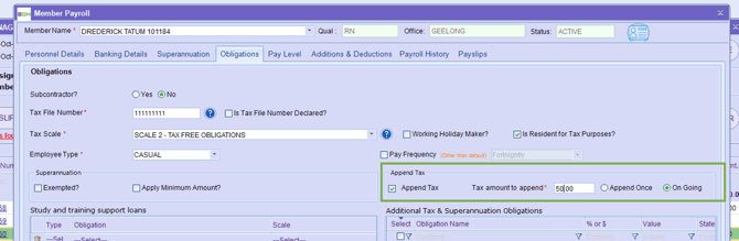 Tax may be adjusted using the Payslip Manager Screen, as described above, but it may also be adjusted on the member’s Member Record.