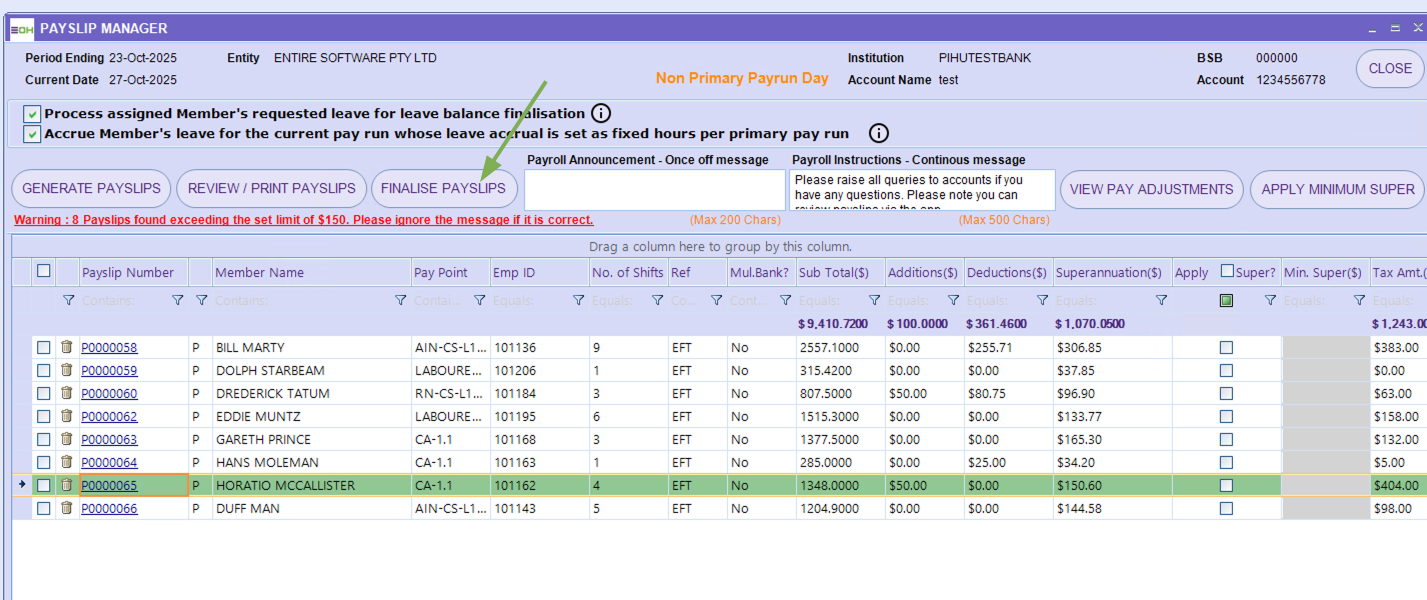 (m) Once all updates have been made, and payslips have been previewed, click on the ‘Finalize Payslips’ button.